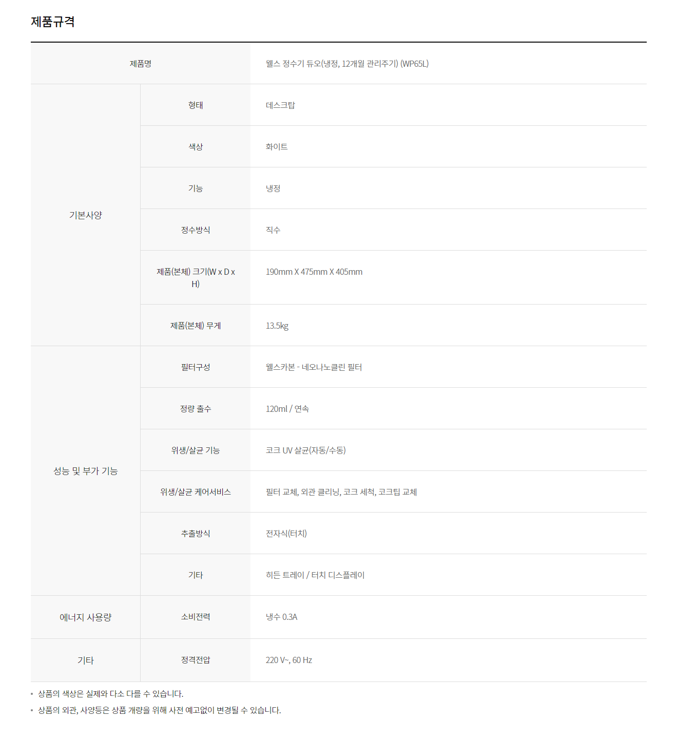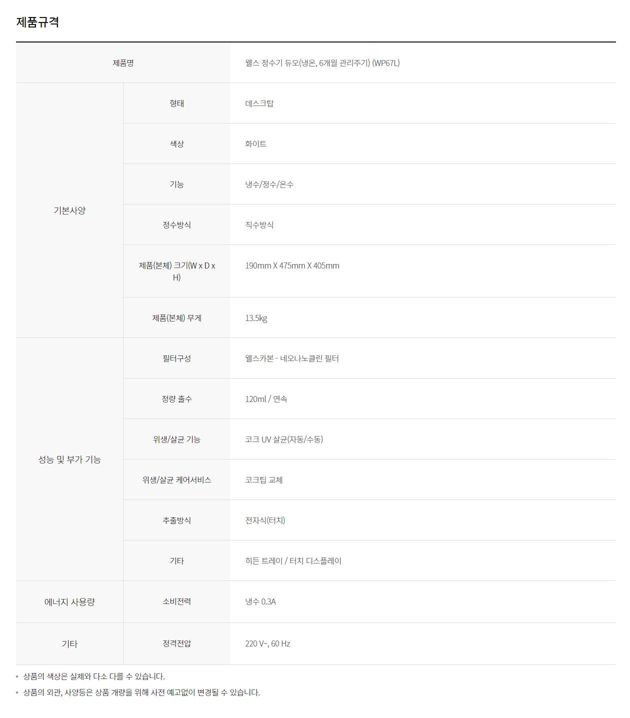 웰스 듀오 냉온정수기 (6개월 방문관리)