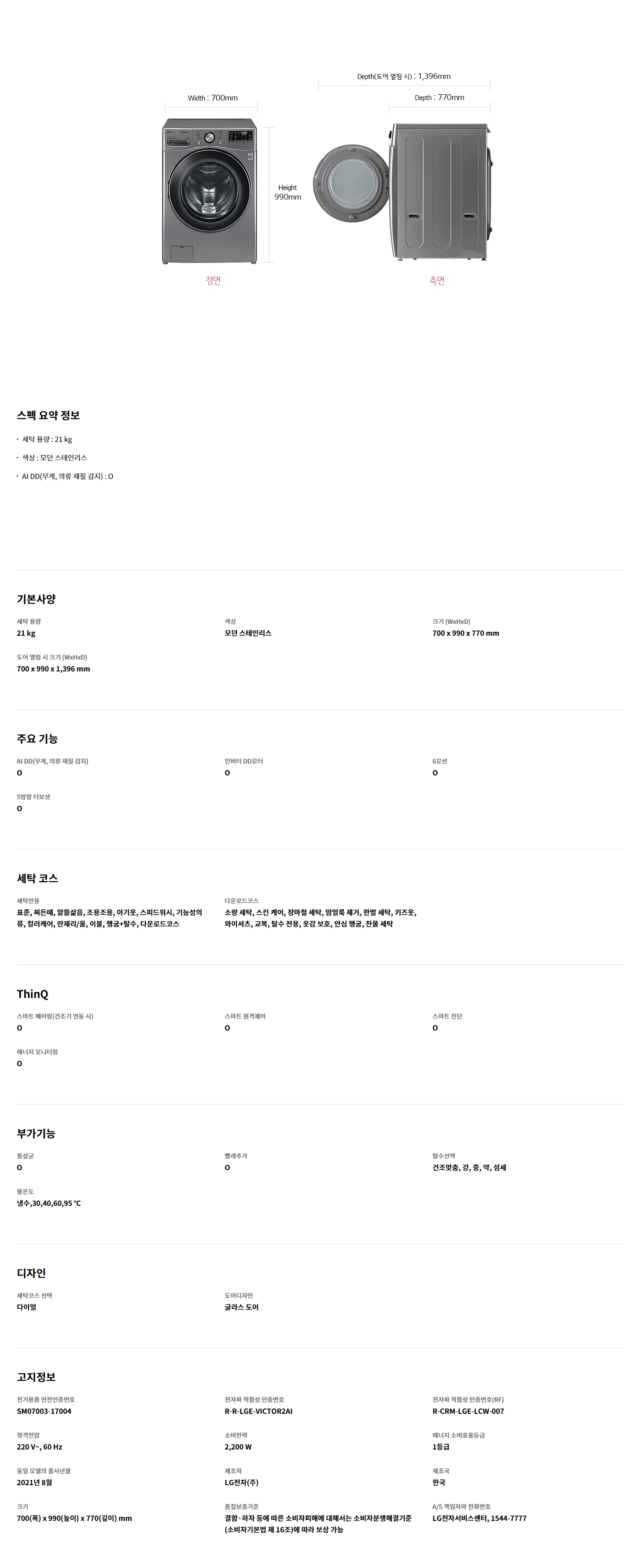 LG전자 트롬 ThinQ 21kg 드럼 세탁기
