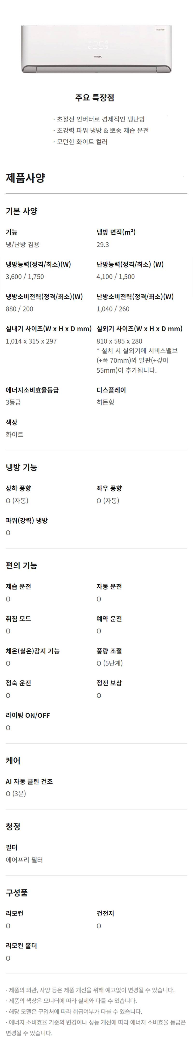 위니아 인버터 벽걸이 9평형 냉난방기