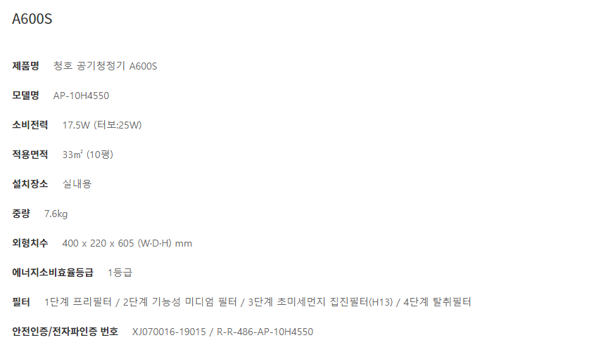 청호나이스 A600S 10평형 공기청정기 (12개월 방문관리)
