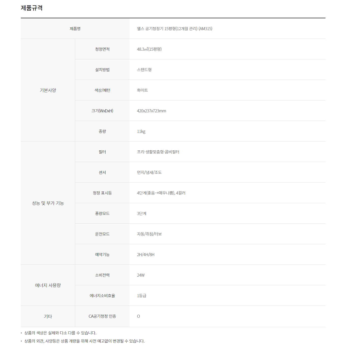 웰스 15평형 공기청정기 (3개월 방문관리)