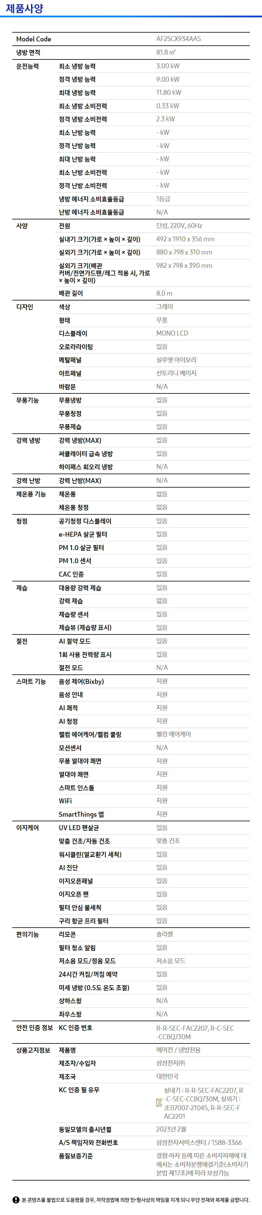삼성전자 BESPOKE 무풍 갤러리 청정 스탠드형 25평형 에어컨 (매립)