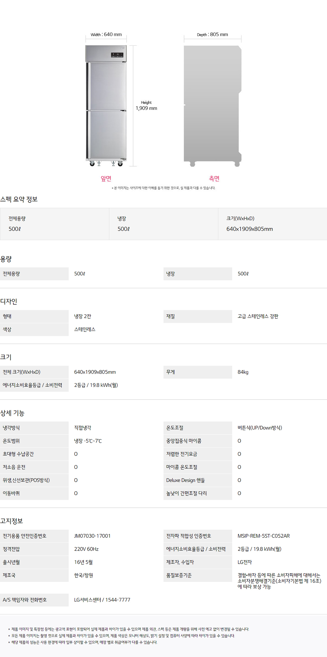 LG전자 업소용 일체형 500L 냉장고 (냉장전용)