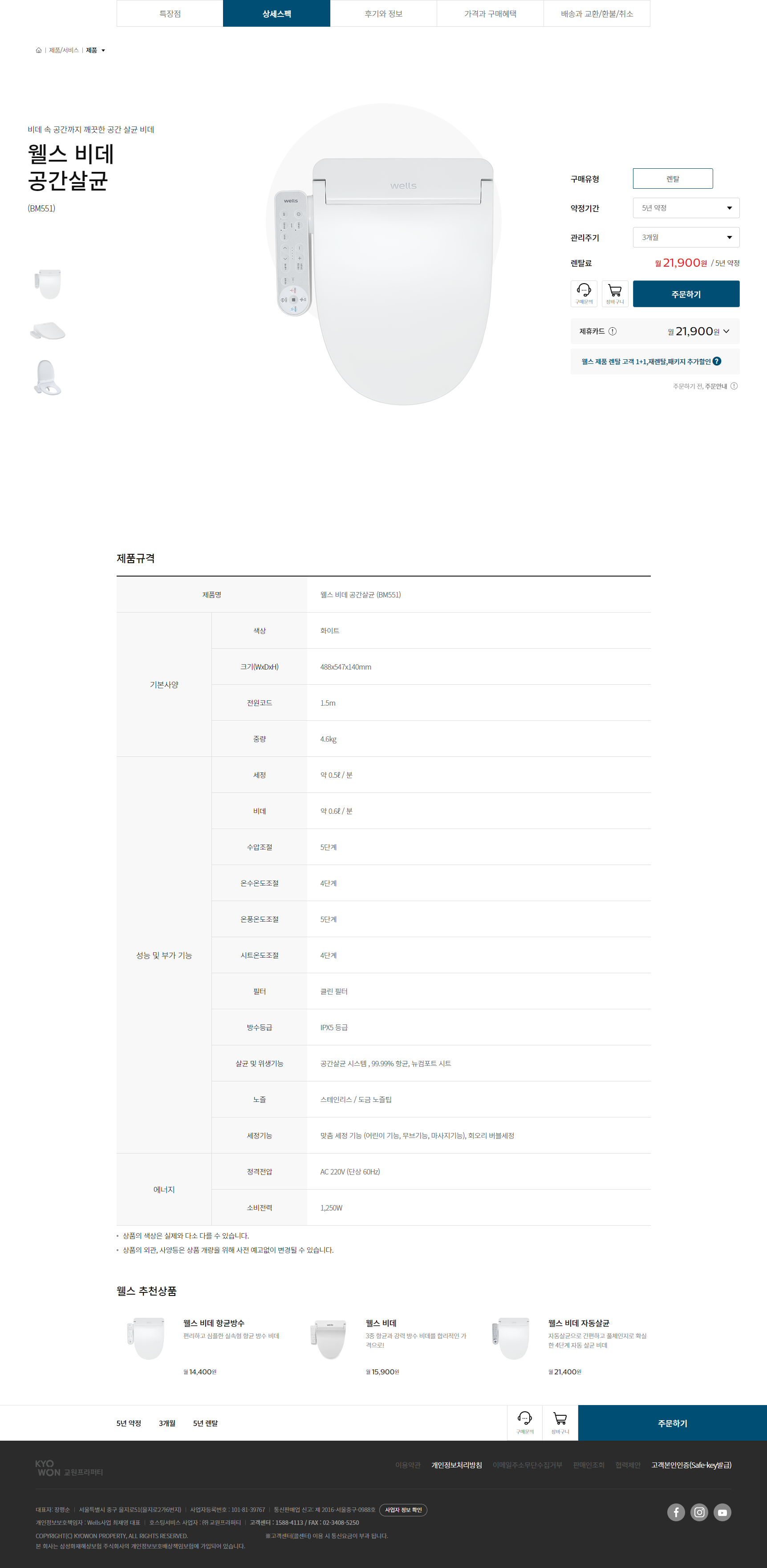 웰스 공간살균 비데 (3개월 방문관리)