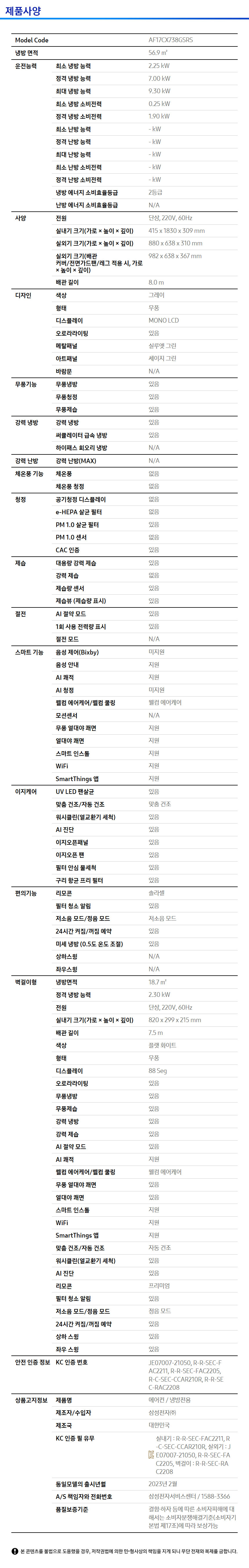 삼성전자 BESPOKE 무풍 갤러리 2in1 17+6평형 에어컨