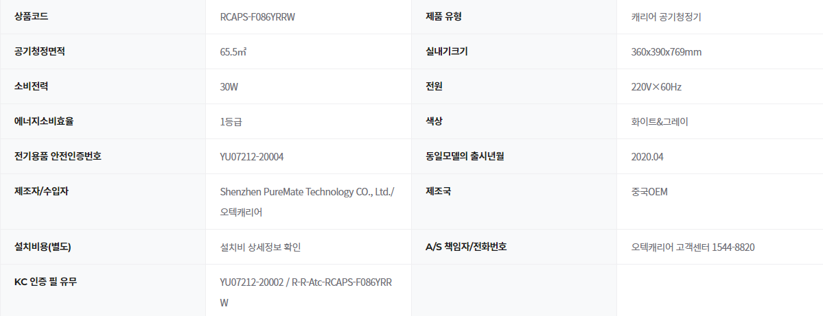 캐리어 클라윈드 20평형 Green 500 공기청정기 (12개월 셀프관리)