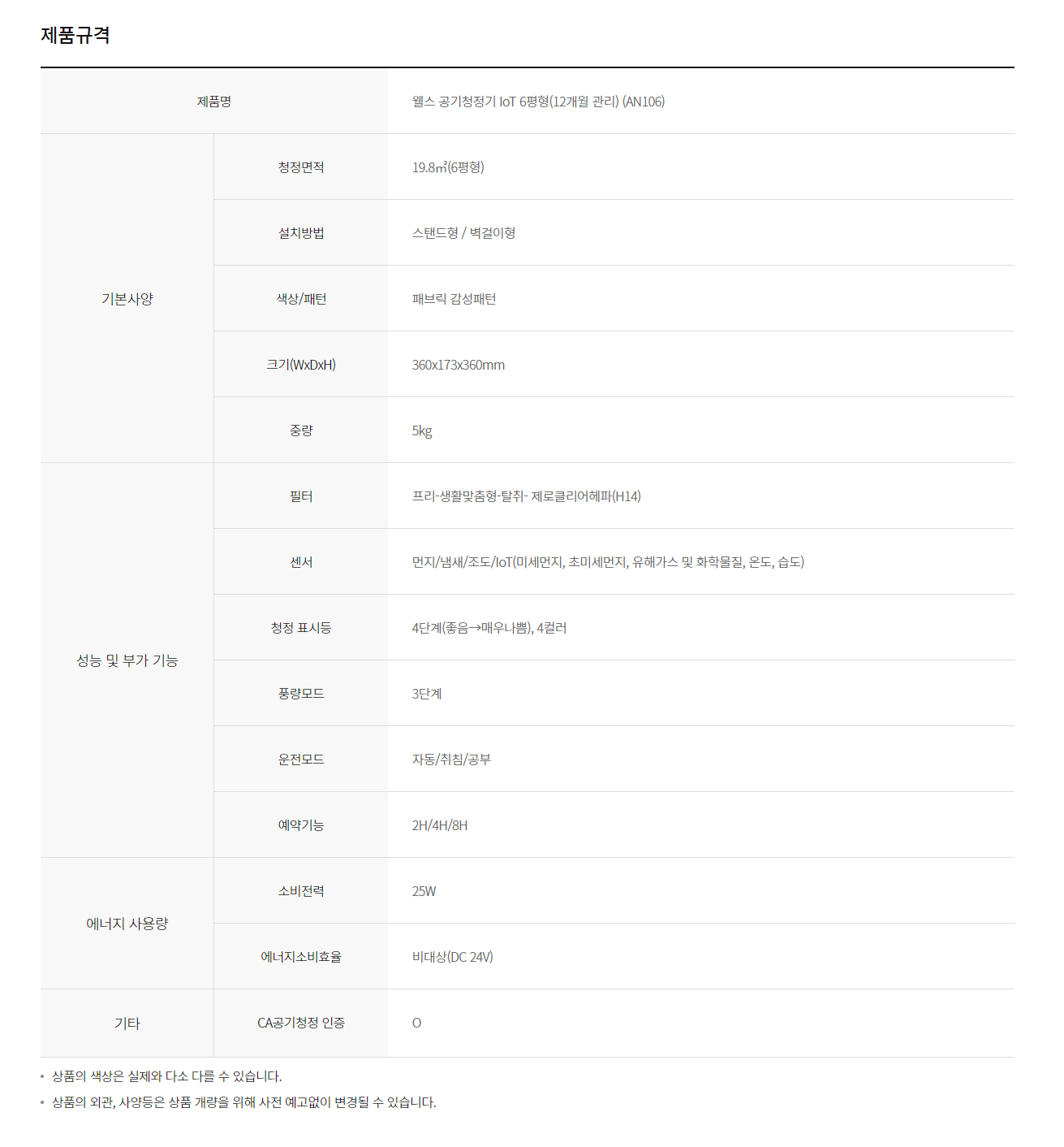 웰스 IoT 6평형 공기청정기 (3개월 방문관리)