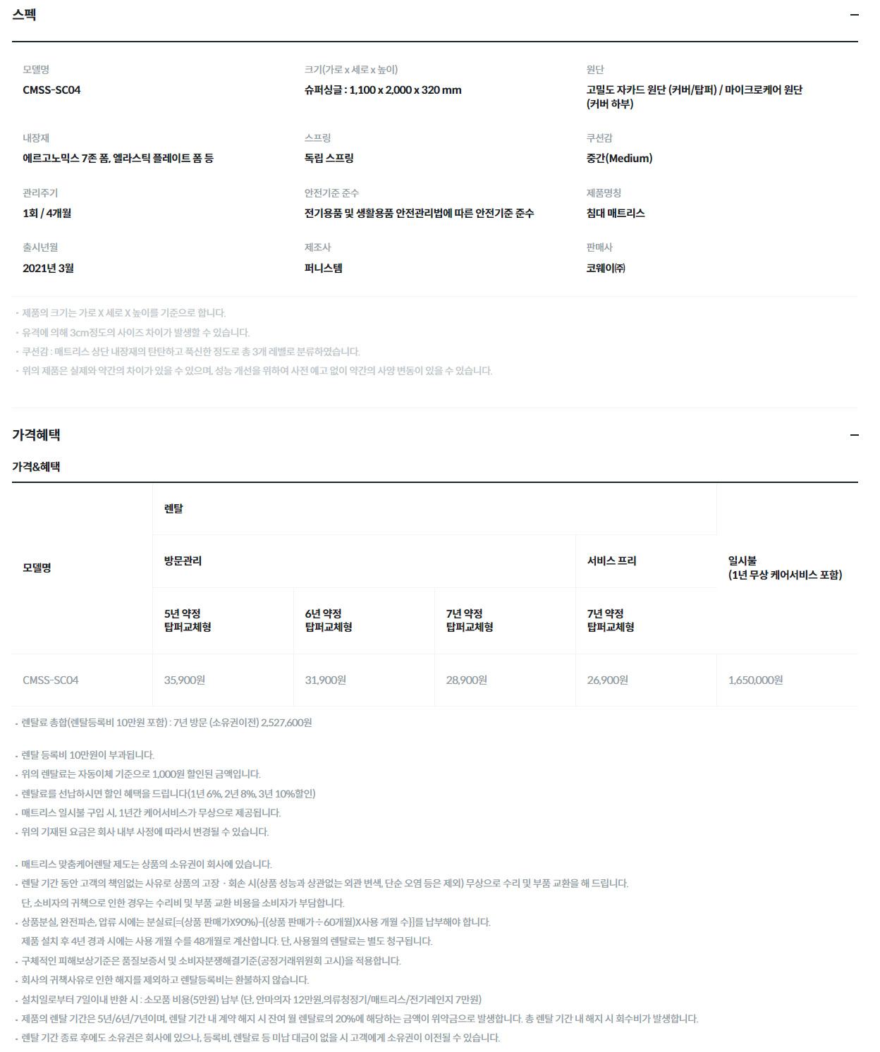코웨이 비렉스 탑퍼교체 프라임 플러스 커버형 매트리스 (SS)